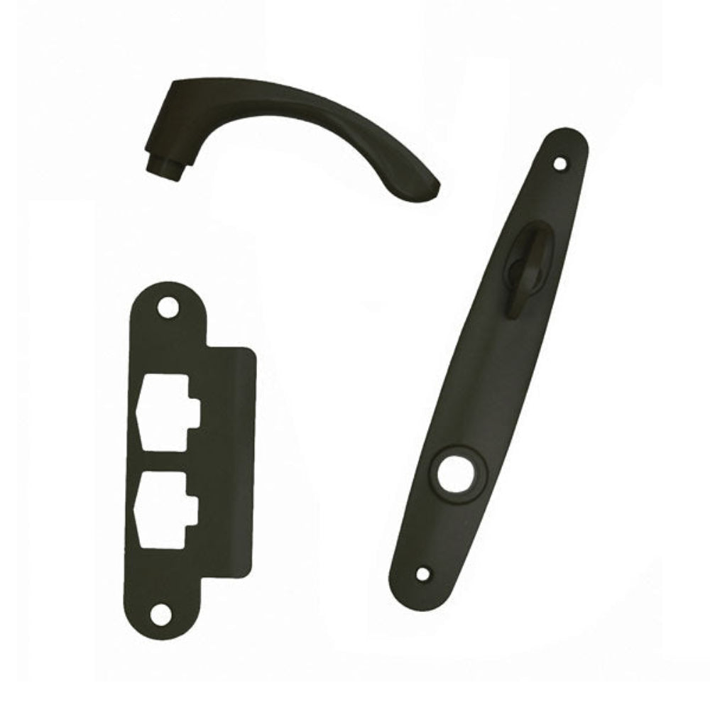 - Set includes inside handles, inside escutcheon plates, limiting plates, gaskets, lock actuator, dummy cylinder, bushing trim adapter, screws and installation instructions.